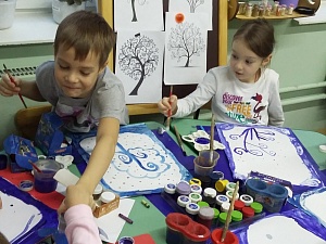 (Звучит музыка Г. Свиридова «Метель». Дети изображают дерево и узор, украшают работу мелкими деталями. Воспитатель помогает «волшебникам» в поиске средств выразительности. Ребятам, которые закончили работу раньше других, педагог предлагает сочинить зимнюю историю.)