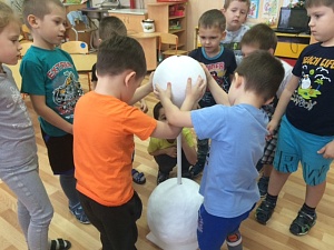 Воспитатель: (Приглашает следующего участника выбрать задание. Уточняет, какого размера в коробе лежат белые шары, что можно сделать из них. Во время работы звучит песня «Снеговик, нос морковкой».)