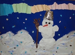 Перед вами лежит картон синего цвета, это фон для зимней картины. Вместе со своим ребёнком вы придумываете сюжет картины. Это может быть снеговик, семья снеговиков, снежный лес, снежный дом. Сначала рисуете все ваши элементы на белой бумаге, затем по контуру обрываете вместе с детьми. (Демонстрация приёмов на примере рисунка снеговика.) Для изготовления головных уборов снеговиков можно использовать цветную бумагу, глаза подрисовать углём, а нос – сангиной.