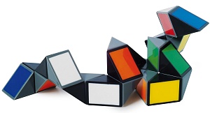 Так что же собой представляет Змейка Рубика? Она сделана из 24-х одинаковых треугольников, соединённых между собой шарнирами, образующими полоску (змейку). Механизм соединения, подобный механизму кубика Рубика, даёт возможность вращать треугольники друг относительно друга на 360 градусов. От того, какие треугольники, в каком направлении и на сколько градусов вы будете вращать, зависит, что за фигура у вас выйдет в результате. В конце манипуляций может получиться и геометрическая фигура (квадрат, ромб и шар) и различные животные (кошка, собака, жираф) и абстрактные фигуры (звёзды) и различные предметы. Из Змейки с лёгкостью получают двухмерные и трёхмерные фигуры, всего известно более 100 вариантов. Никакая другая головоломка не может похвастаться таким обилием вариантов сборки.