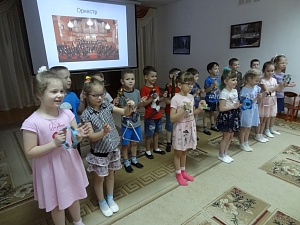 Музыкальный руководитель: Бывают оркестры маленькие, а бывают большие, где играет 50, 100 и даже больше музыкантов! Сегодня я расскажу вам о таком оркестре, а помогут в этом мне волшебные лучи. (Включаются лучи.) Вы хотите увидеть настоящий оркестр? Тогда мне нужна ваша помощь! (Педагог зовёт ребёнка, который активизирует луч, появляется изображение оркестра). Ребята, так выглядит симфонический оркестр.