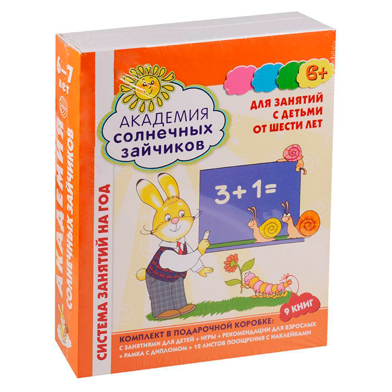 Комплект «Академия солнечных зайчиков» в подарочной коробке: 9 книг с занятиями для детей, игры, рекомендации для взрослых, рамка с дипломом, 12 листов поощрения, 500 наклеек для поощрения.