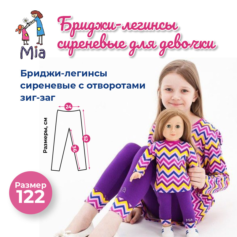 Леггинсы насыщенного фиолетового цвета, на резинке. Отлично сидят на ребенке. Они удобные и комфортные. Длина по всей ноге. Внизу есть надпись "Mia" из страз и широкие манжеты с ярким разноцветным принтом. Точно такой же рисунок у туники. Рукава у нее точно такого же цвета, как и леггинсы. Образ получается полным и завершенным. Очень нравится, что одежда яркая. Ребенка видно в толпе детей. Одежда эта повседневная, потому что свободная и удобная. Одевать отлично в садик и на прогулки. Состав леггинсов: 95% хлопок и 5% эластан.