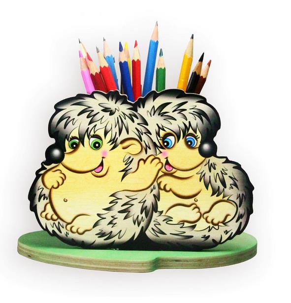 Такая ярко оформленная подставка просто необходима для маленьких художников, чтобы канцелярские принадлежности не катались по столу, не падали на пол и не терялись среди других вещей. Карандашница всегда сможет сохранить всё в целостности сохранности. Например: «Ежата» (16,8 х 13 см), «Львята» (17 х 18,4 см), «Лягушата» (19,5 х 17,5 см), «Лисички» (16 х 14,5 см), «Пчёлки» (13,2 х 18,5 см), «Кот и пёс» (10,1 х 12,9 см), «Заячья семейка» (15,4 х 12,9 см), «Семён с подружкой» (17,1 х 13,2см), «Зайки с морковкой» (14,7 х 13,3 см), «Амурчик и Мурлик» (15,2 х 16 см), «Белки – художницы» (14,4 х 13,3 см) – вот лишь малый перечень декоративных «штучек», которые могут стать отличным подарком малышу.