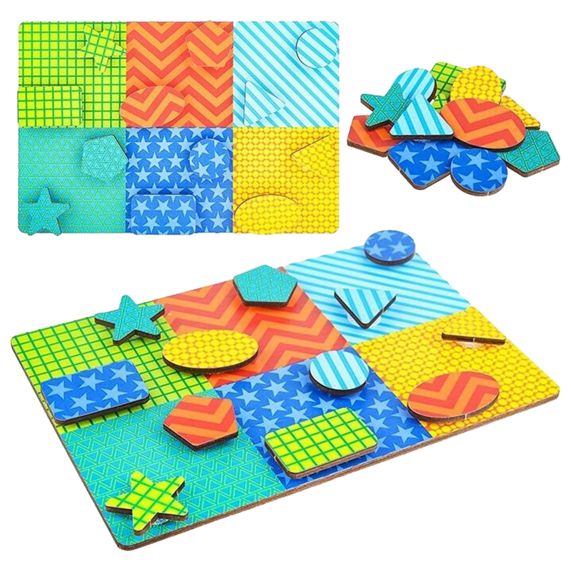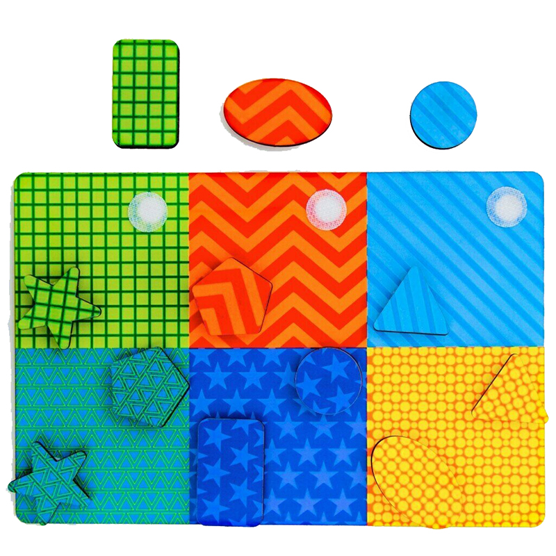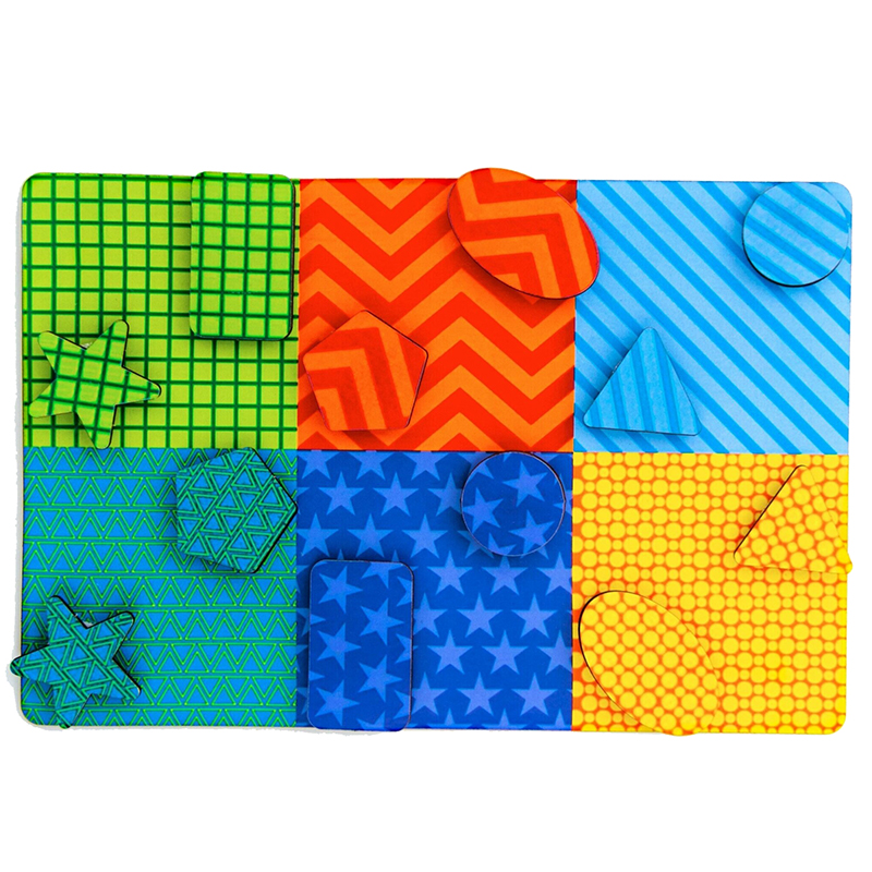 Складывать фигурки на панель, в соответствии с сектором. Узор и цвет геометрической фигуры должен совпасть с сектором на панели. Предложите ребенку найти «домик» или «коврик» для геометрических фигур.