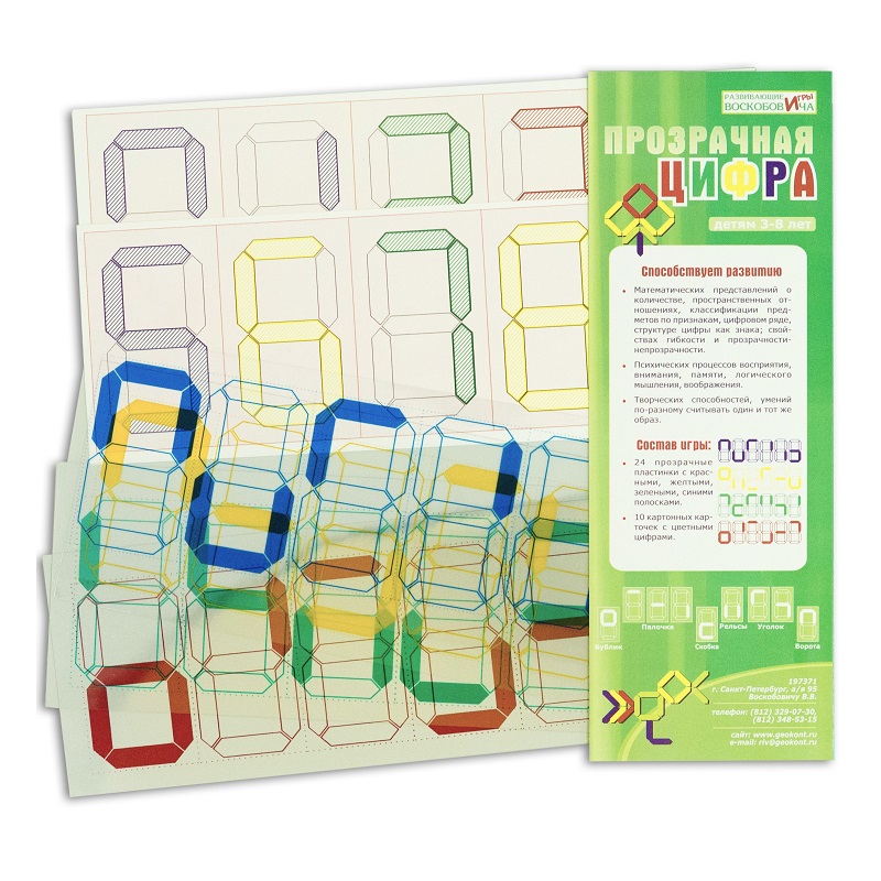 Игра «Прозрачная цифра» от ООО Развивающие игры Воскобовича входит в комплект конструктора «Прозрачный квадрат», но может быть предложена для игровой детской деятельности и как самостоятельный дидактический материал. Игры с «Прозрачной цифрой» способствуют развитию элементарных математических представлений ребёнка, его зрительного внимания, ассоциативной памяти, мыслительных операций сравнения, группировки, классификации, анализа и обобщения.