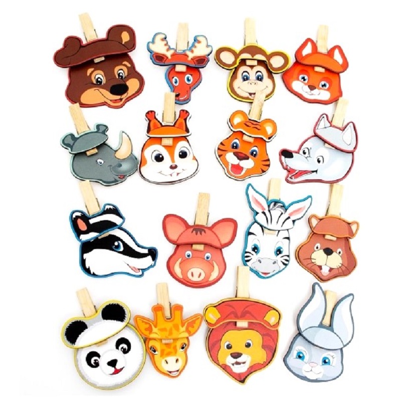 Детали (голов животных), прищепок (в виде ушей животных) и деревянной коробочки для их хранения. Коробочку можно дополнительно использовать как материал для игры, разбирать и складывать обратно, развивая логику и мелкую моторику.