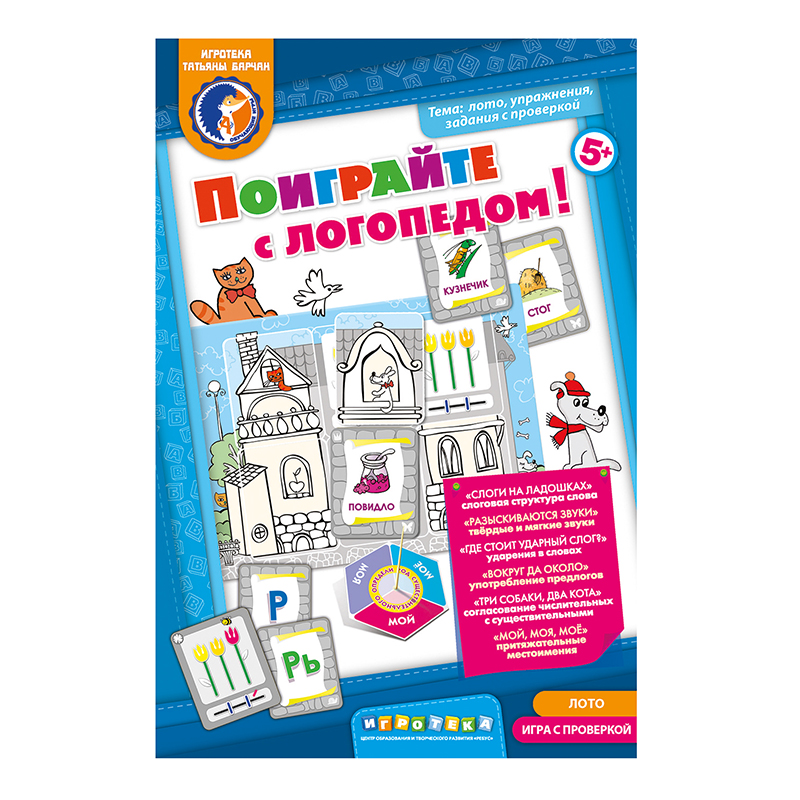 - «Вокруг да около» - перед игроком лежит игровое поле с изображением домика. Ведущий раскручивает волчок, на одной стороне которого написаны предлоги («на», «под», «за», «перед», «из», «в»), а с другой («у», «по», «около» «с», «над», «из-за»). Игровую сторону может выбрать как сам ведущий, так и игрок. При полной остановке волчка ребёнок должен придумать фразу, используя картинку и выпавший на волчке слог, например: кошка грелась на крыше дома.