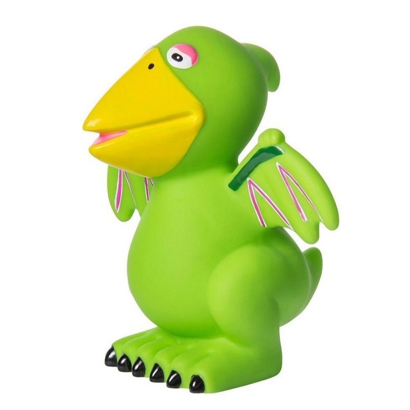 Внешне очень яркая, симпатичная игрушка в форме зелёного динозврика с жёлтым раскрытым клювом и распахнутыми крыльями станет лучшим другом ребёнка во время водных процедур. Динозаврик комфортно помещается в маленькой детской ладошке. Фигурка динозаврика может самостоятельно стоять на ровной поверхности. Её можно использовать не только в воде, но и во время обычных сюжетно-ролевых игр.
