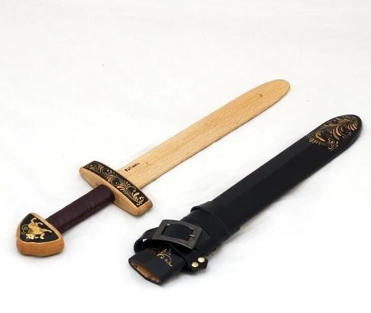 В игровой набор помимо меча входят ножны и поясной ремень из натуральной кожи. Меч от бренда «Ратникъ» сделан вручную вырезан из массива бука –высококачественного, прочного и натурального материала с естественным запахом древесины. Изделие тщательно ошкурено и отшлифовано, не имеет сколов и заусенцев, безопасно для здоровья ребёнка. Оружие расписано традиционным узором (вязью) – тип письма, в котором буквы соединены витиеватым орнаментом. Игрушка тщательно покрыта нетоксичным лаком, устойчивым к внешнему воздействию.