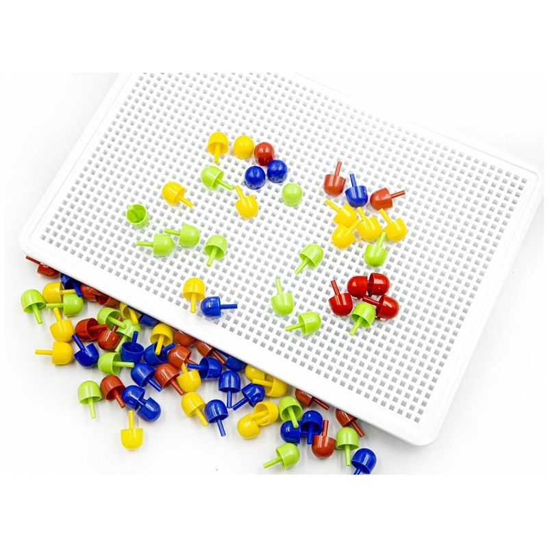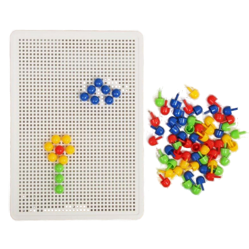 В наборе 176 разноцветных фишек-гвоздиков и прямоугольное белое игровое поле. Фишки в наборе яркие, крупные и округлой формы. Малышу будет удобно держать их в руках.