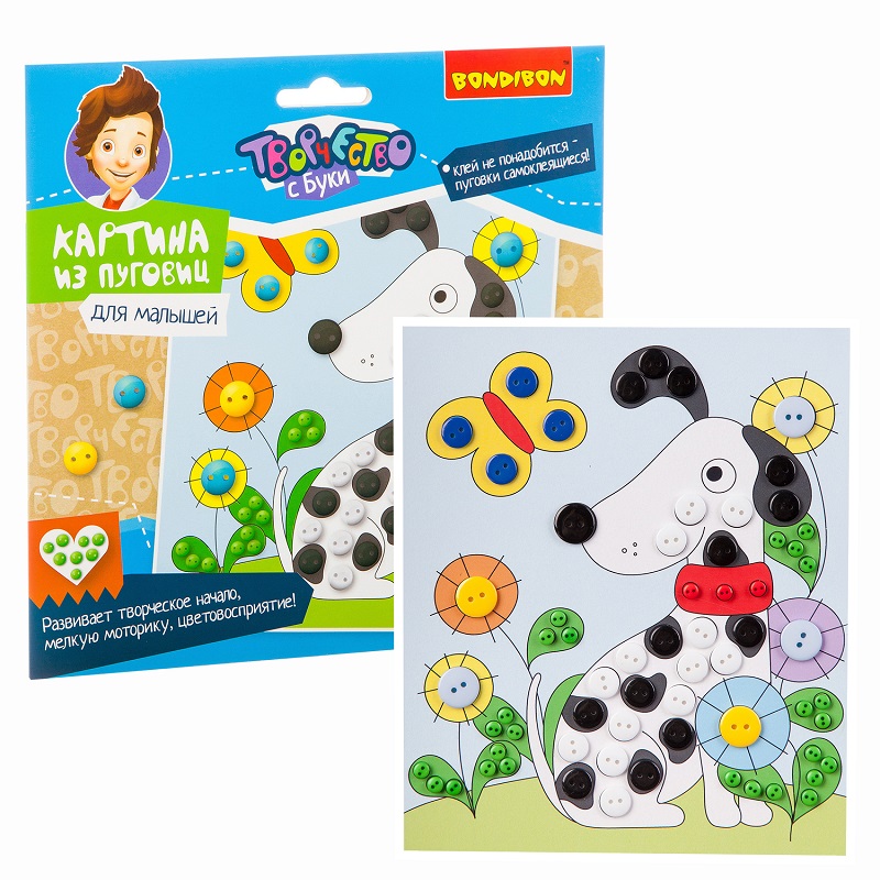 Мы очень любим продукцию от ТМ Бондибон, особенно их творческие наборы. Набор для творчества «Картина из пуговиц. Собачка» тоже очень понравился.
