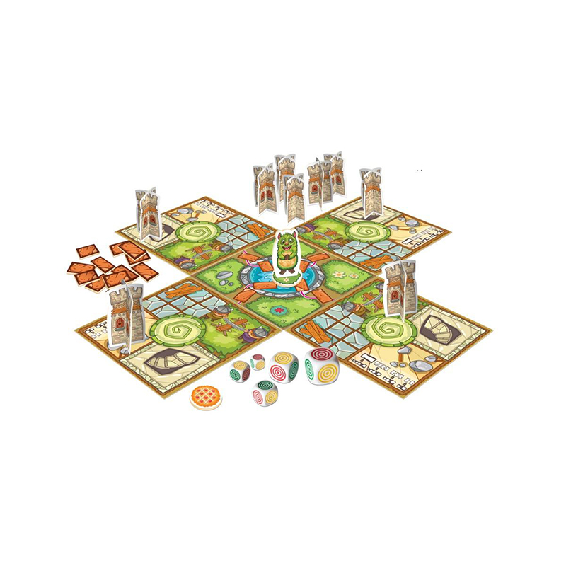 Подготовка к игре: необходимо отделить элементы замка, монстра, пирог и кирпичи от рамок, а затем собрать из них башенки и монстра. Игровое поле выкладывается на середину стола. Каждый играющий берёт фундамент и кладёт его в конце дорожки со своей стороны поля. Башни и кирпичи рядом с полем – это строительная площадка. Каждый игрок берёт одну башню и устанавливает её на своем фундаменте. Ход игры: участники стараются построить пирамидку из кубиков от большего к меньшему. В основании башни самый большой, наверху самый маленький. В свой ход игрок бросает сразу все пять кубиков. Самый большой кубик покажет цвет, который игрок будет собирать. Оставшиеся четыре кубика перебрасываются. Нужно, чтобы выпало как можно больше граней такого же цвета, как и на большом кубике, для этого кубики несколько раз можно перебросить. Но после каждого броска нужно поставить на пирамидку хотя бы один кубик. Если выпавший на кубиках цвет совпадает с цветом, который выпал на большом кубике, можно поставить сразу несколько. За собранные пирамидки игрок получает кирпичики, которые можно обменять на башню.