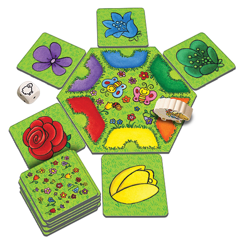 Правила игры очень просты. В центре игровой поверхности выкладываем цветочное поле в виде шестиугольника. Каждая сторона геометрической фигуры имеет свой цвет: жёлтый, фиолетовый, синий, красный, зелёный, оранжевый. Главную героиню Кучеряшку устанавливаем на любой грани. Колоду с картами перемешиваем и кладём рядом с лугом «рубашками» наверх, две карточки при этом переворачиваем, и прикладываем к полю, ориентируясь по цветовой палитре. Игра начинается с того что игрок кидает кубик, если выпадает овечка он может передвинуть её на любую цветовую грань, если же на кубике он видит число выраженное в виде чёрных точек, то он двигается на определённое место по часовой стрелке. В конце хода участник берёт карточку и прикладывает её к нужной грани, если во время движения он останавливается уже на выложенной карте, то цветок идёт в букет для будущего венка. Игра продолжается до тех пор, пока не закончиться карты и после подсчёта бутонов будет объявлен победитель.