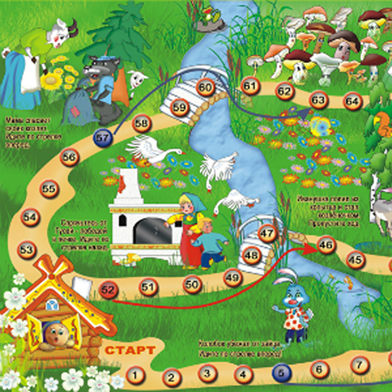 Правила игры очень просты: игроки рассаживаются вокруг игрового поля. Выбирают фишку понравившегося цвета (красный, зелёный, синий, жёлтый). По очереди бросают игральный кубик, чтобы узнать, у кого право первого хода. Первым ходит игрок, у которого выпало наибольшее число на кубике. Остальные участники ходят по очереди по часовой стрелке. Бросая кубик, игроки могут передвигаться по полю к финишу на число шагов, равное выпавшему числу на кубике. Во время сказочного путешествия по тропинке, необходимо выполнять указанные задания: "идти по стрелке вперёд", "идти по стрелке назад", "пропустить ход".