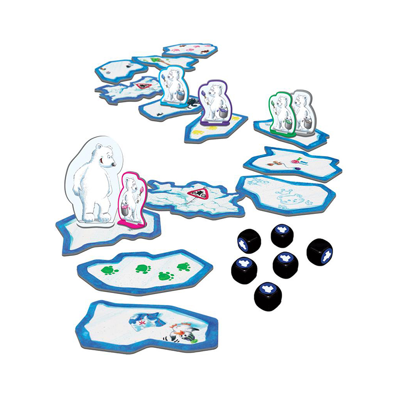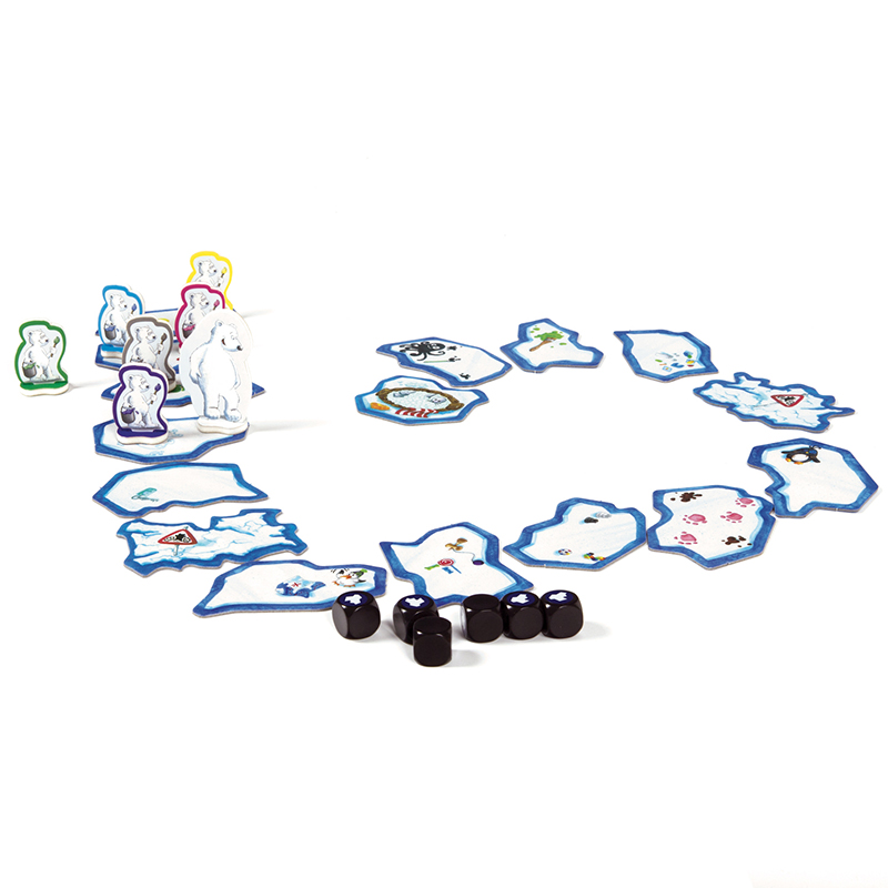 Суть игры простая, расставляем льдины, кидаем все шесть кубиков, и Папа медведь начинает шагать по льдинам. Сколько граней со льдинами выпало, столько шагов делает Папа.