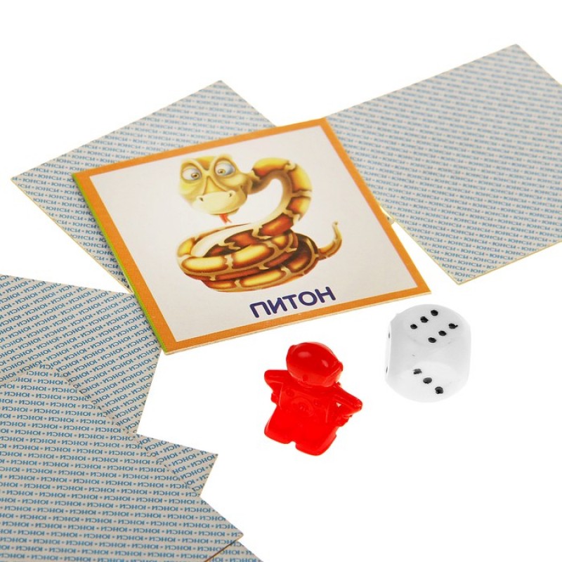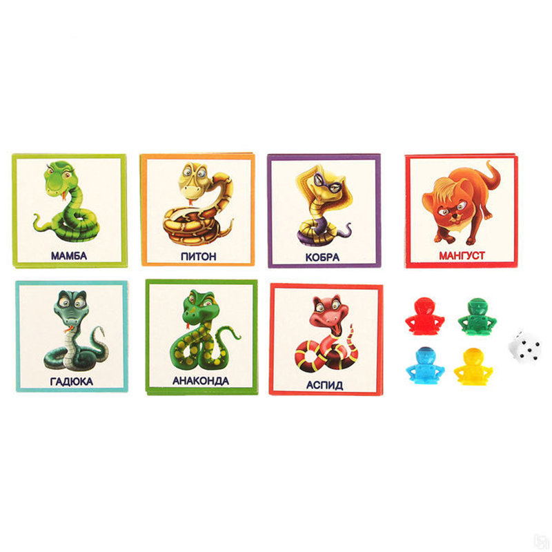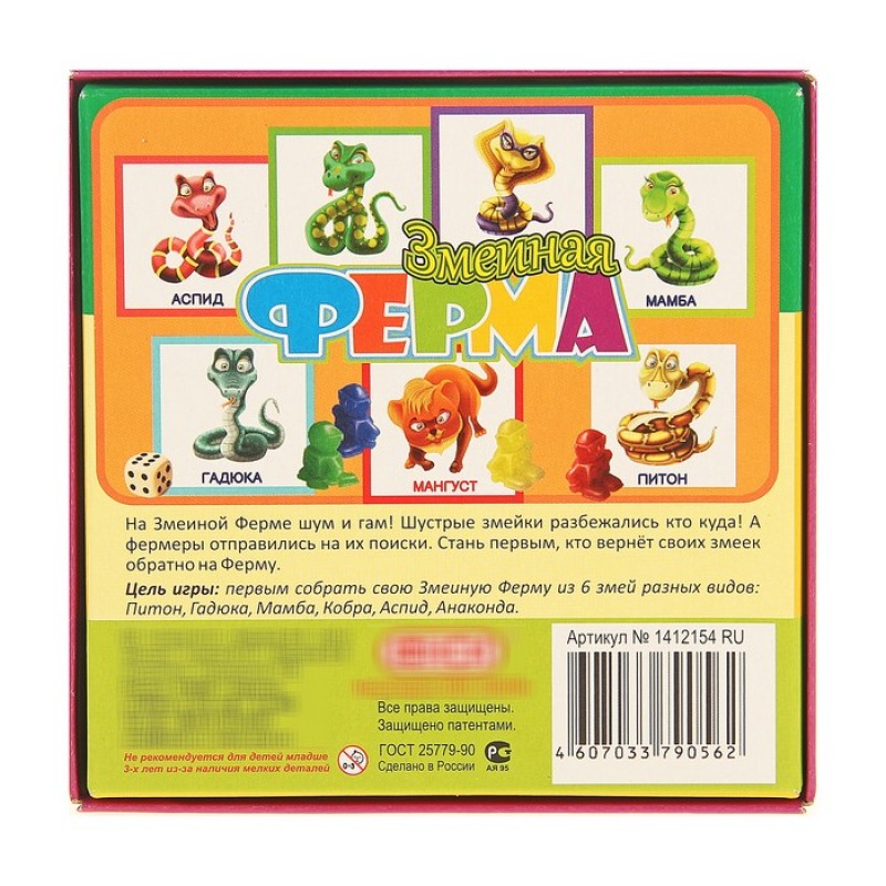 Настольная игра «Змеиная ферма» ТМ «Юнси» рекомендована детям от трёх лет и старше. Основная цель: создание фермы, в которой будут обитать змеи разного вида (анаконда, кобра, мамба, аспид, питон). В комплект входит набор из 24-х карточек с изображением пресмыкающихся и мангуста; пакетик с разноцветными фишками в виде фигурок (4 шт.); кубик (1 шт.); инструкция. Карточки выполнены из многослойного картона, а фишки – из пластика. Картинки яркие, тщательно прорисованные, животные узнаваемые. Игра рассчитана на компанию 2–4 игроков. Правила просты и понятны. Необходимо бросать кубик и передвигать человечков-змееловов по разложенным картинками вниз карточкам. Где остановились, ту змею и забираем. Но если вместо змеи оказался мангуст, тогда игроку придётся отдать змею из своей фермы. Настольная игра обязательно понравиться малышам, порадует их. Во время создания своей змеиной фермы дети изучат названия некоторых змей, счёт, интересно и весело проведут досуг.