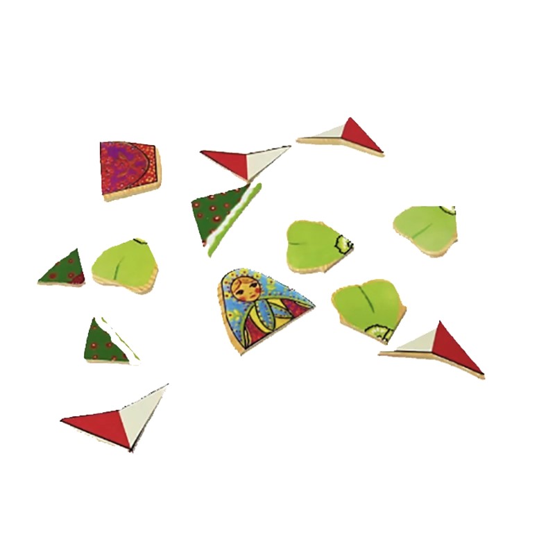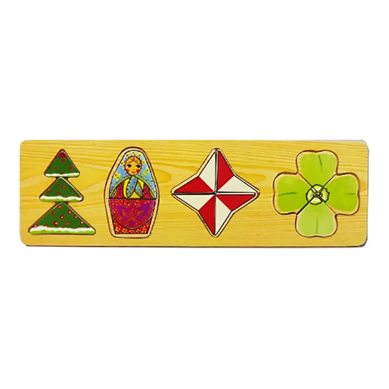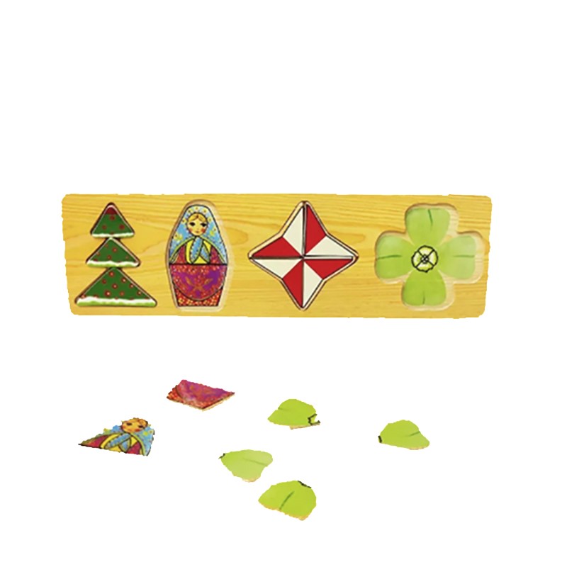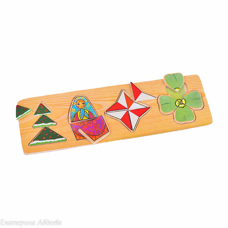 Игра представляет собой планшет-основу из фанеры с вырубкой четырёх фигурных изображений, делящихся в свою очередь на составные части. Здесь есть цветок (4 элемента), матрёшка (2 элемента), ёлочка (3 части), звёздочка (4 элемента). Подложка этих изображений цветная, с иллюстрацией собираемых предметов. За счёт такой наглядности существенно облегчается сборка элементов, ребятам легче ориентироваться в будущем изображении. Фанера – экологически чистый материал, специальная обработка краев изделия исключает возможность появления сколов и царапин. Комплект сертифицирован, соответствует требованиям ГОСТ и СанПин. Игрушка не содержит формальдегид.