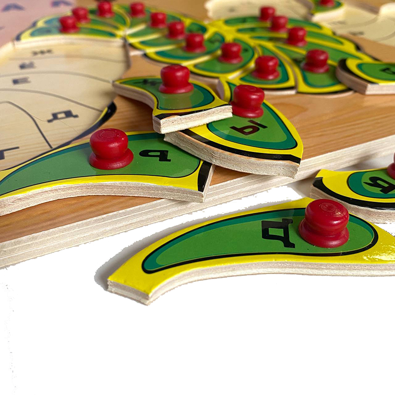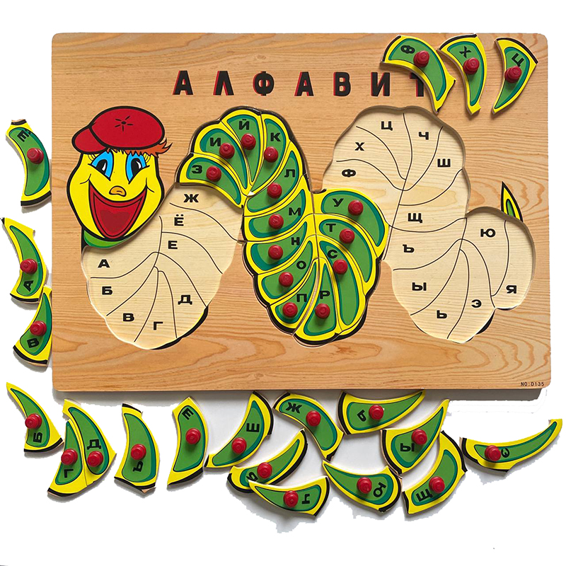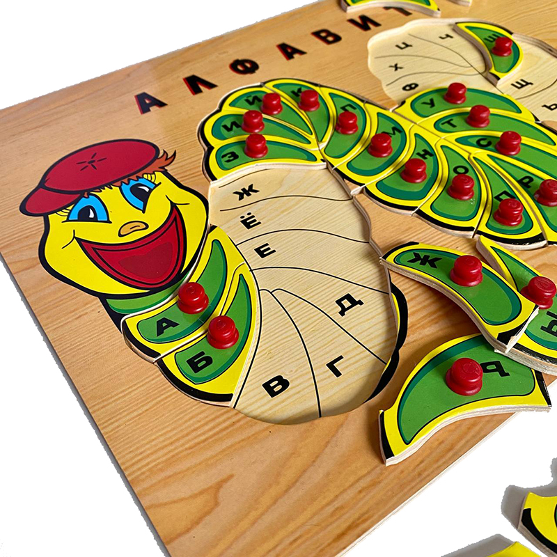 Тельце гусеницы состоит из 33-х вынимающихся сегментов, каждый из которых соответствует букве русского алфавита (33 буквы), каждая по 2 х 7 см. Буквы – это наклейки, качественно приклеенные к деталям гусеницы. Форма элементов-пазлов сделана так, что буквы можно было поставить только на своё место. Расположены буквы в алфавитном порядке от головы гусеницы до её хвоста, что позволит ребёнку изучить и запомнить правильное их расположение. Детали насекомого легко вынимаются с помощью маленькой выпуклости. Под каждым сегментом нарисована соответствующая вкладышу буква, поэтому малышу первое время будет легче найти нужно место. Гусеница окрашена в яркие цвета. Краска, используемая для этого, нетоксична и безопасна для здоровья. Рамка выполнена из экологически чистого материала – дерева. Весь планшет тщательно обработан, качественно ошкурен. Дети, играя с ним, не поранятся. Упакована игра в термоусадочную плёнку.