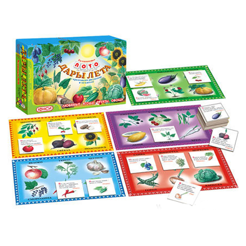 С 1992 года издательство настольных игр "ЮНСИ" выпускает полезные и развивающие настольные игры, в том числе детское лото. Лото "Дары лета" – это игра о самом вкусном и полезном. Благодаря предложенному набору, ребёнок изучит фрукты, ягоды и овощи. В комплект для игры входит: 5 полей с рисунками плодов и растений, а также 30 карточек с интересными загадками. Подходит игра мальчикам и девочкам возраста от трёх лет и старше. Одновременно в лото "Дары лета" могут играть от двух до пяти человек. Время игры составляет примерно 20 минут. Упакована игра в яркую картонную коробку. Размер упаковки 28 х 19 х 3,5 см.