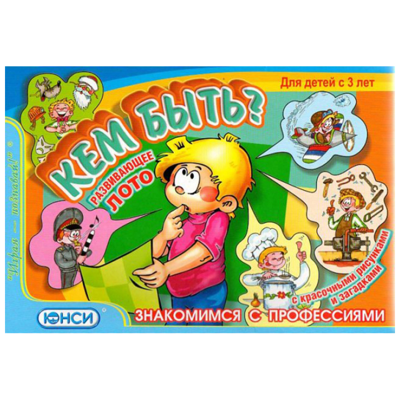 Развивающее лото «Кем быть?» предназначено для детей от трёх лет и старше. В набор ТМ «ЮНСИ» входит пять больших игровых полей с яркими тематическими картинками. На каждой из них изображён сюжет, имеющий отношение к той или иной профессии (шахтёр, пограничник, врач, учитель, водолаз, слесарь). Также предусмотрены карточки (30 шт.) с загадками на заданные темы. Подробная инструкция разъяснит ход игровых действий. Играть могут от 2-х до 5-и участников. Правила игры просты. Игроки кладут перед собой одно или более игровых полей. Ведущий читает загадку. Дети отгадывают загадку, если на их полях имеется изображение соответствующей профессии – забирают себе. Победителем станет тот, кто быстрее всех соберёт все нужные карты.
