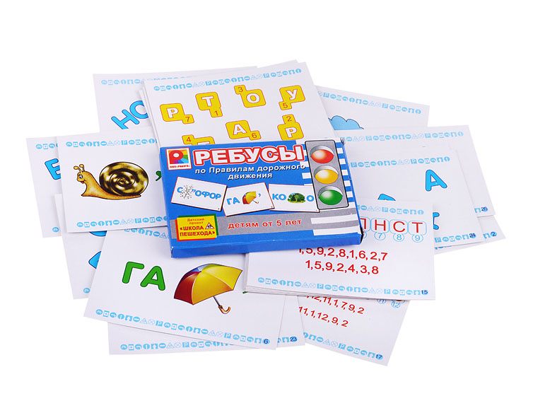 Ребусы по правилам дорожного движения от российского производителя игрушек творческой мастерской «Радуга» представляет собой увлекательную обучающую игру для детей дошкольного и младшего школьного возраста. Ребята в занимательной игровой форме смогут познакомиться с такими важными темами, как безопасность на дороге и правилами дорожного движения. В комплектацию игры входит двадцать шесть картонных карточек с ребусами. Ребус – это закодированное особым способом слово, часть которого может быть заменена изображением. Также здесь встречаются запятые слева или справа, сверху над картинкой или словом, которые обозначают, какую букву по порядку следует исключить из слова.