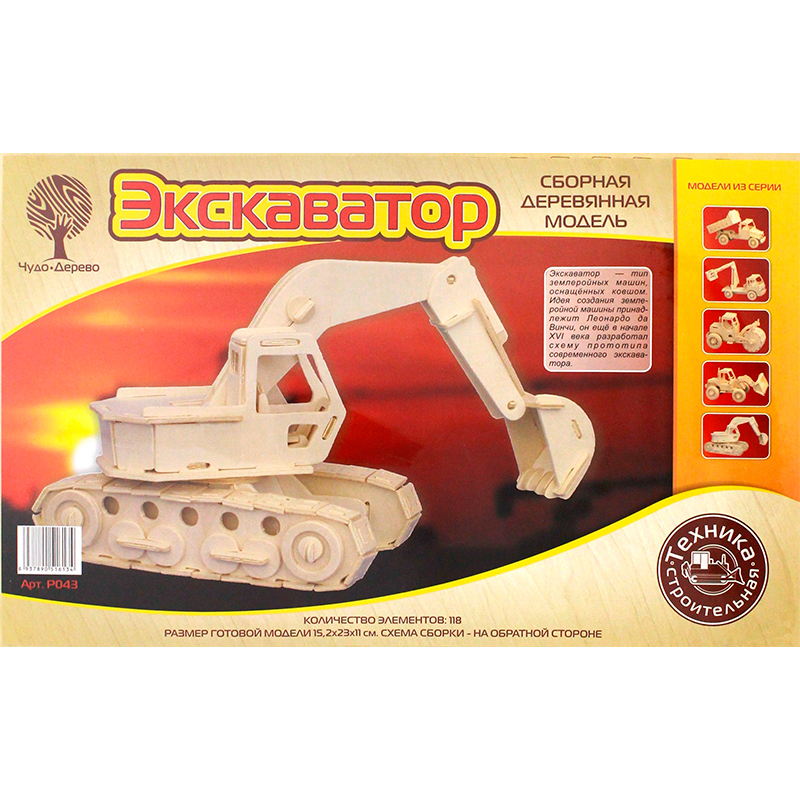 Сборная деревянная модель «Экскаватор» рекомендована для мальчиков от пяти лет и старше. В комплект входит: 118 деревянных деталей, которые заранее вырезаны на фанерных планшетах; кусок наждачной бумаги; пошаговая инструкция с последовательной нумерацией соединения деталей. Готовый экскаватор может черпать ковшом, двигаться с помощью вращающихся колёс, поворачивать кабину с водителем вокруг своей оси.