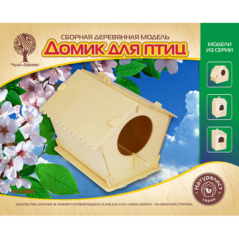 Сборная деревянная модель «Домик для птиц» 80016 является необычным дизайнерским решением. В собранном виде он имеет не классическую прямоугольную форму, а шестигранник с двухскатной крышей. Размер готового изделия 21,5 х 15,4 х 15,3 см. Вес игрушки 200 гр. Домик продаётся в разобранном виде. На основах из фанеры размещены детали (18 шт.) будущего строения – это четыре стены, одна из которых имеет круглое отверстие для проникновения птиц вовнутрь, две части крыши, пол, шесток, крепёжные элементы.