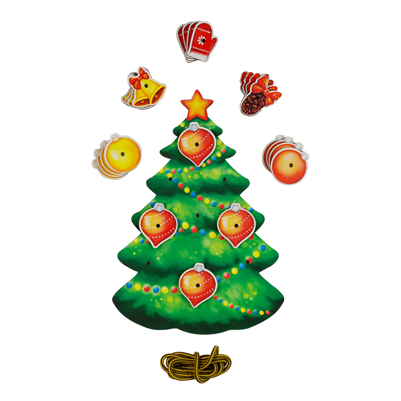 3. Можно решать математические задачки. «На елочку Аня повесила пять шариков и два колокольчика. Сколько всего игрушек повесила Аня на елочку?» Задачу сопровождайте игровыми действиями. Положите на елочку шарики и колокольчики. Пересчитайте их вместе с малышом. Затем поработайте со шнуровкой.