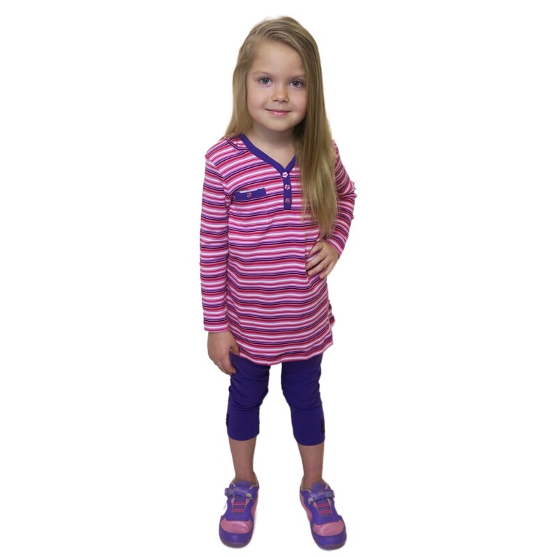 Худи сейчас кто только не носит, всем возрастам к лицу, а детям еще и удобно, потому как есть капюшон, который спасет от мелкого дождика или вдруг появившегося ветерка. Наша модель интересна своим принтом в полоску, цветовая гамма широка и позволяет комплектовать ее с легинсами фиолетового или любого другого цвета в тон полосок. С джинсами и юбками худи также будет смотреться довольно хорошо, можно подобрать поверх джинсовый или тканевый жилет.