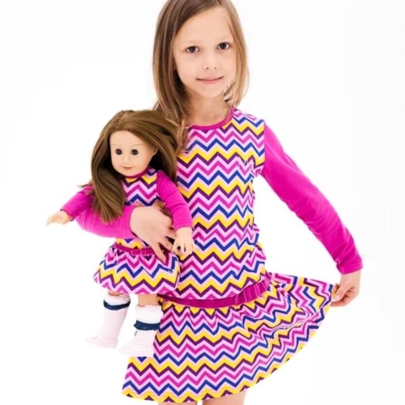 Лонгслив трикотажный, принт зигзаг, вырез круглый. Данный логслив идет в комплекте с юбкой аналогичной расцветки и велюровым пояском цвета фуксии.
