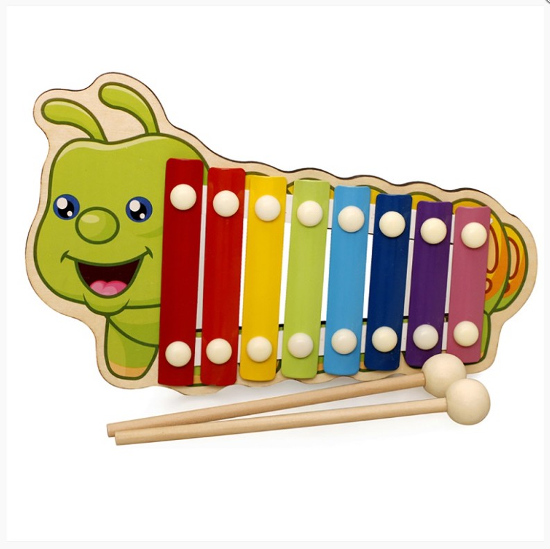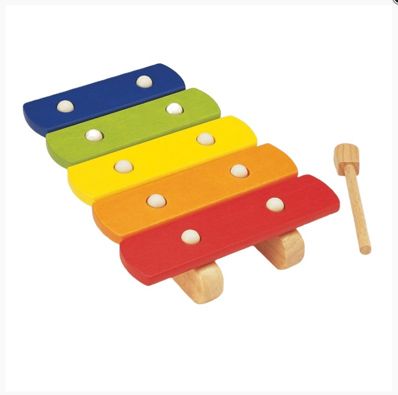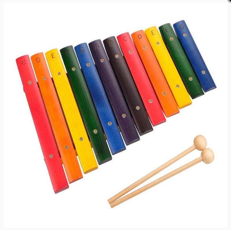 Например, ксилофон "Радуга" немецкого бренда Hape прекрасный инструмент для развития мелкой моторики, обучению счёту, цветовому и музыкальному восприятию. На деревянных основаниях располагаются пластины разных цветов (красный, оранжевый, жёлтый, зелёный и синий). На каждой пластинке изображена картинка с нотками, кружочками, скрипичными ключами и звёздочками. В комплекте поставляются две деревянные палочки, наконечники которых также раскрашены в разные цвета, на ручках имеются пластиковые наконечники, чтобы малыш случайно не поранился. Миниатюрный размер музыкальной игрушки позволяет брать его с собой на прогулку, для этого ксилофона с одной стороны имеется удобная ручка-переноска.