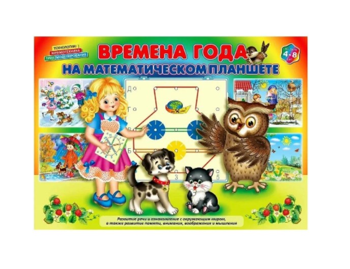 Времена года на математическом планшете — альбом с заданиями для детей от 4 до 8 лет. Альбом направлен на развитие логического и математического мышления, внимания, памяти, воображения и мелкой моторики. В игровой форме ребёнок выполняет задания на математическом планшете, знакомится с временами года, учится анализировать, сравнивать и классифицировать объекты, а также строить узоры и изображения с помощью резинок. Занятия с альбомом развивают аналитическое мышление, творческие способности и пространственное воображение, формируют интерес к математике и познанию окружающего мира.