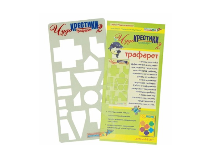 Трафарет "Чудо-крестики 2" — графический тренажер, основанный на методике В. Воскобовича. Пособие представляет собой прозрачную пластину с отверстиями из элементов игры "Чудо-Крестики 2". В комплекте имеется цветная инструкция с мнтодической авторской сказкой, схемами и заданиями. Ребенок, передвигая прозрачный трафарет на листе бумаги, присоединяет (совмещает) выбранные элементы для создания фигурок и образов. Следующий этап — обводка, дорисовка, штриховка разных видов и в разных направлениях. Таким образом развиваются графические навыки, точность мелких движений, координация "глаз-рука", произвольность зрительного и слухового внимания, аналитические способности, речь. Пособие рассчитано на возраст от 3 до 10 лет.