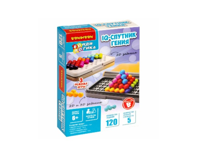 IQ-Спутник гения — увлекательная логическая игра из серии БондиЛогика от Bondibon, созданная для детей от 6 лет и взрослых. Игроку необходимо расположить элементы на игровом поле так, чтобы они соответствовали выбранному заданию и образовывали правильную комбинацию.