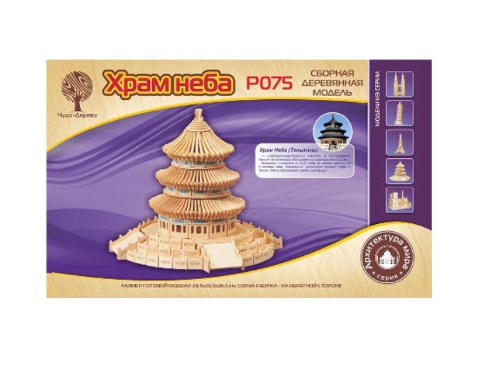 Сборная деревянная модель «Храм Неба», «Храм Саграда Фамилия», «Собор Святого Петра», «Покровский собор» серии «Архитектура мира» ТМ «Чудо-Дерево» предназначена для детей от 5 лет и станет увлекательным занятием для творчества и знакомства с выдающимися памятниками мировой архитектуры. Модель собирается из деревянных деталей без использования клея и позволяет поэтапно создать детализированный макет знаменитых архитектурных сооружений.