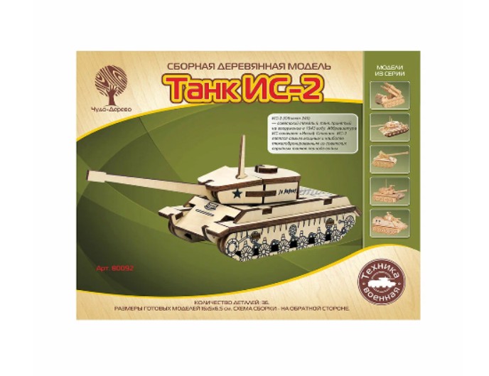Сборная деревянная модель «Танк ИС-2» серии «Военная техника» ТМ «Чудо-Дерево» предназначена для детей от 5 лет и станет увлекательным занятием для творчества и знакомства с легендарной боевой техникой времен Второй мировой войны. Модель собирается из деревянных деталей без использования клея и позволяет поэтапно создать узнаваемый макет тяжелого танка.