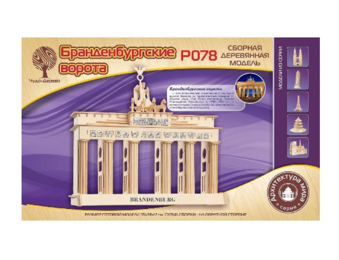Сборная деревянная модель «Триумфальная арка», «Бранденбургские ворота» серии «Архитектура мира» ТМ «Чудо-Дерево» предназначена для детей от 5 лет и станет увлекательным занятием для творчества и знакомства с известными архитектурными памятниками. Модели собираются из деревянных деталей без использования клея и позволяют поэтапно создать узнаваемые макеты знаменитых достопримечательностей.