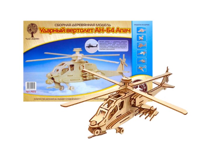 Сборная деревянная модель «Ударный вертолет АН-64 Апач» серии «Авиация» ТМ «Чудо-Дерево» предназначена для детей от 5 лет и станет увлекательным занятием для творчества и знакомства с современной авиационной техникой. Модель собирается из деревянных деталей без использования клея и позволяет поэтапно создать детализированный макет знаменитого вертолета.
