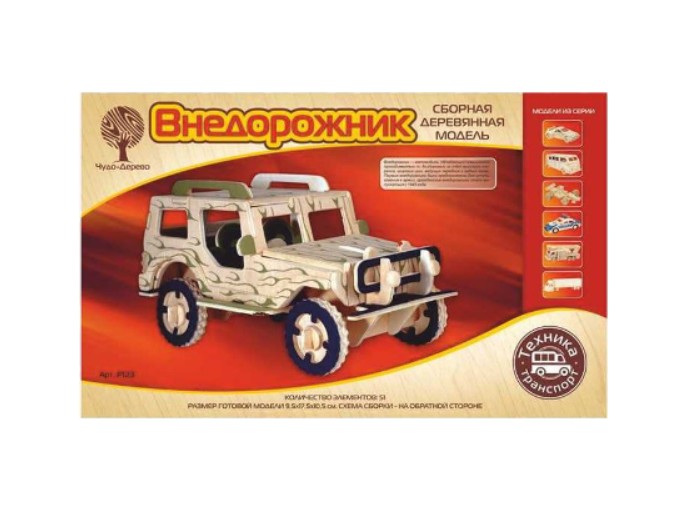 Модель изготовлена из натурального дерева, с использованием безопасных красок и качественной обработкой всех элементов. Сборная деревянная модель «Внедорожник» серии «Техника, транспорт» ТМ «Чудо-Дерево» подходит для самостоятельных и совместных игр, становясь отличным подарком и любимой игрушкой ребенка.