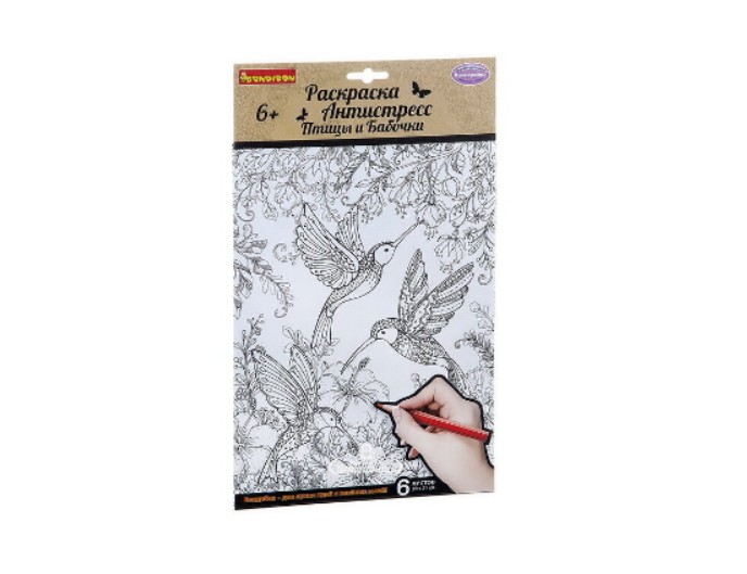 Раскраска-антистресс “Птицы и Бабочки" 6 листов, бренд Bondibon
