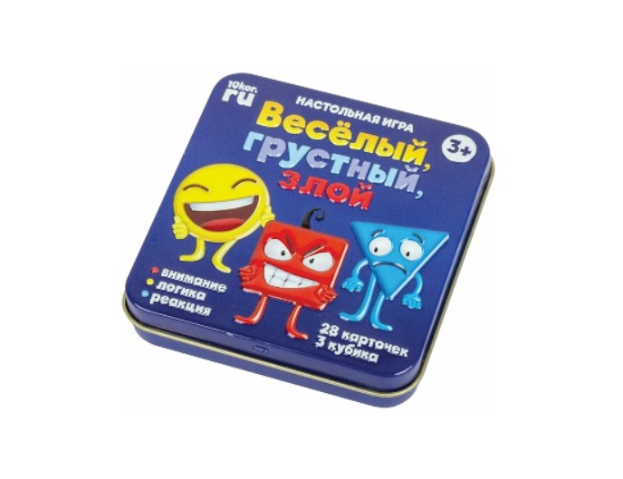 Настольная игра "Веселый, грустный, злой" — занимательная игра в жестяной коробке для детей от 3 лет. Она помогает познакомиться с эмоциями, научиться их различать и выражать. В процессе игры ребенок развивает эмоциональный интеллект, внимание, память и коммуникативные навыки. Яркие карточки и простые правила делают обучение увлекательным, а игра способствует лучшему пониманию чувств — своих и окружающих.