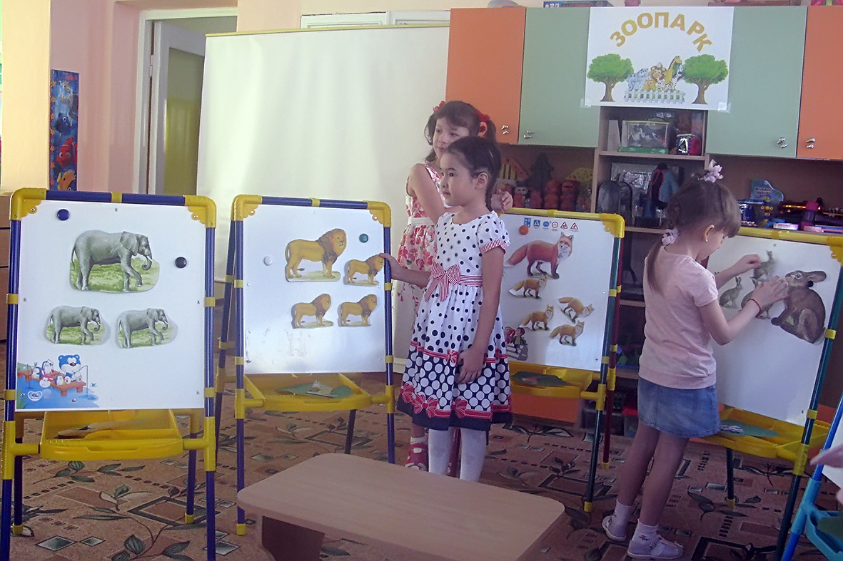 Логопед: Скажите, пожалуйста, а кем были эти животные, когда они были маленькими. (Дети берут детёныша и ставят рядом с вольером.)