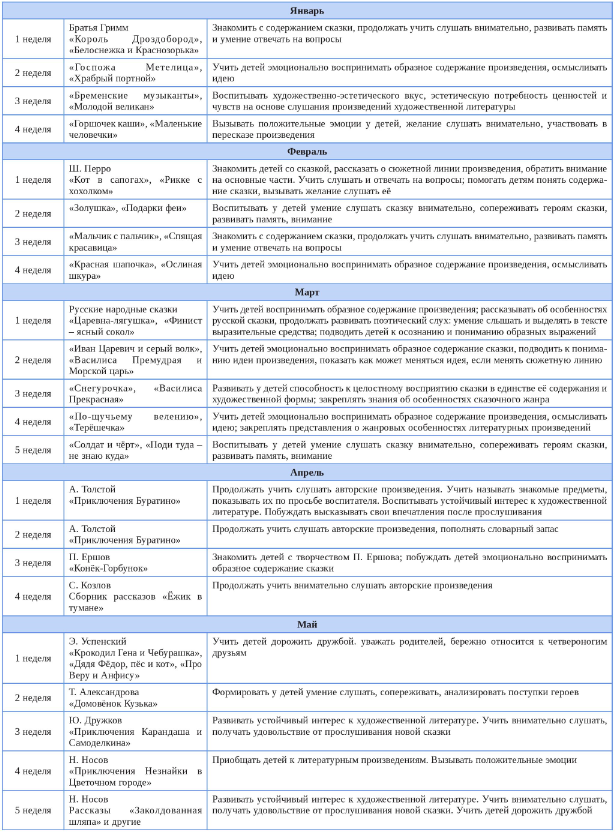Данный примерный перспективный план был разработан в целях обогащения словарного запаса воспитанников, развития их творческих способностей и воображения, а также для углубления дружеских взаимосвязей между воспитателем и детьми. Большую часть представленной в плане литературы мы читали перед дневным сном. Другую часть литературы мы читали в свободное время от основной непосредственной образовательной деятельности. После прочтения сказок проводились беседы с воспитанниками и, по желанию, выполнялись различного вида работы – лепка, аппликация, театрализованная деятельность и сюжетно-ролевые игры.