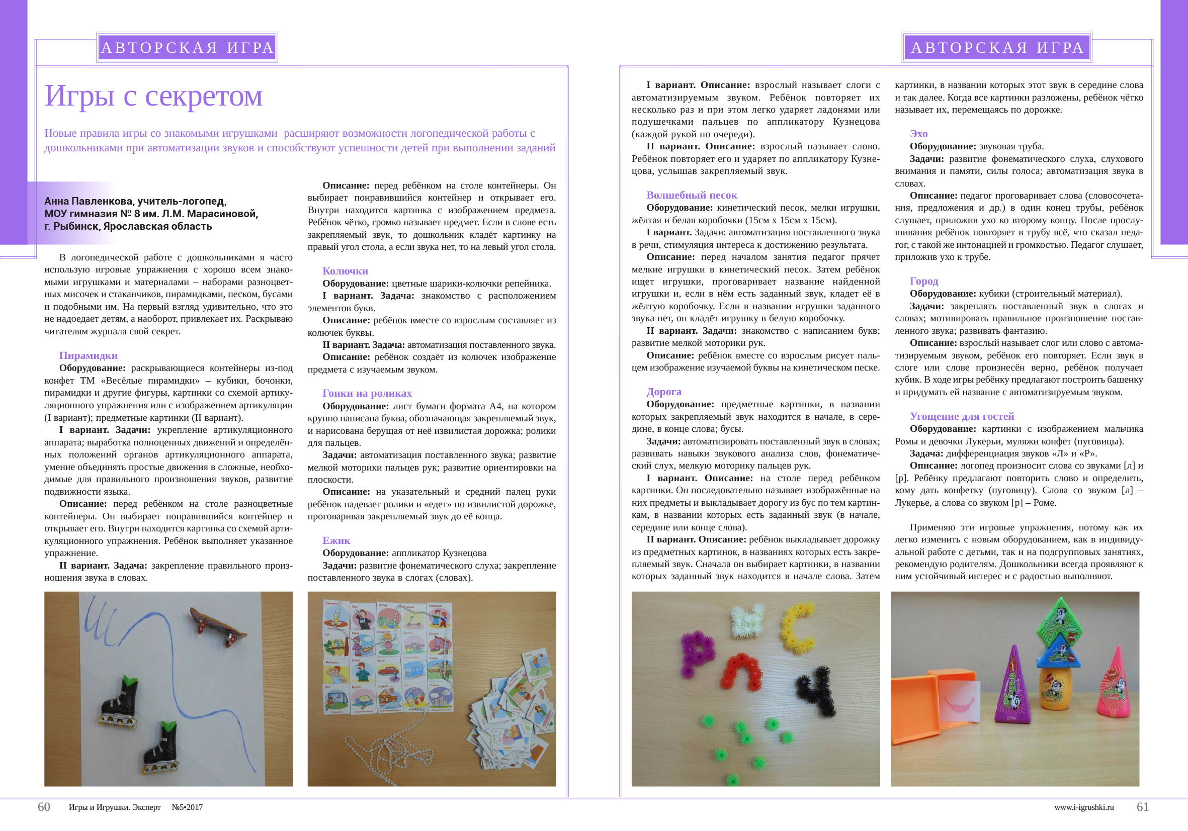 Уважаемая редакция! Теперь мы знаем, что в журнале «Игры и игрушки. Эксперт» много интересных конспектов, которые могут быть использованы студентами педагогических факультетов университетов при прохождении практики с детьми. О журнале узнали от старшего воспитателя детского сада, когда обсуждали план нашей самостоятельной работы с дошкольниками. Статьи многих авторов понравились идеями, сюжетными линиями, использованием игр, привнесением в окружающую обстановку элементов сказочности и таинственности. Недавно мы взяли за основу при подготовке НОД конспект Е. Жолудевой «Путешествие в Тридевятое царство» (интегрированная ОД) для детей старшей группы. Частично изменили задания и раздаточный материал, добавили «хитрые» вопросы волшебнику, опыты с магнитом, подвижную игру. Получилось здорово! И нам, и детям было интересно. Важно, что сразу ориентировались на правильно выстроенный конспект, поэтому удалось больше времени уделить деталям подготовки занятия.