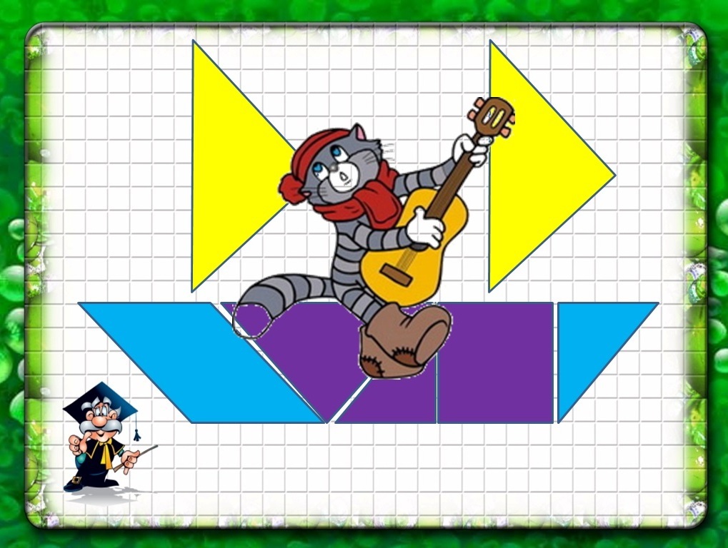 Учитель: Тогда давайте его составим! (Повторение геометрического материала. Два ученика на доске из геометрических фигур составляют корабль, после чего все дети считают, сколько в нём треугольников, четырёхугольников.)