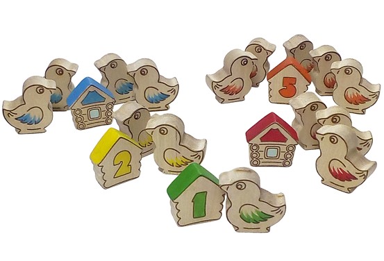 В набор входит 20 деталей: 5 домиков и 15 птичек.