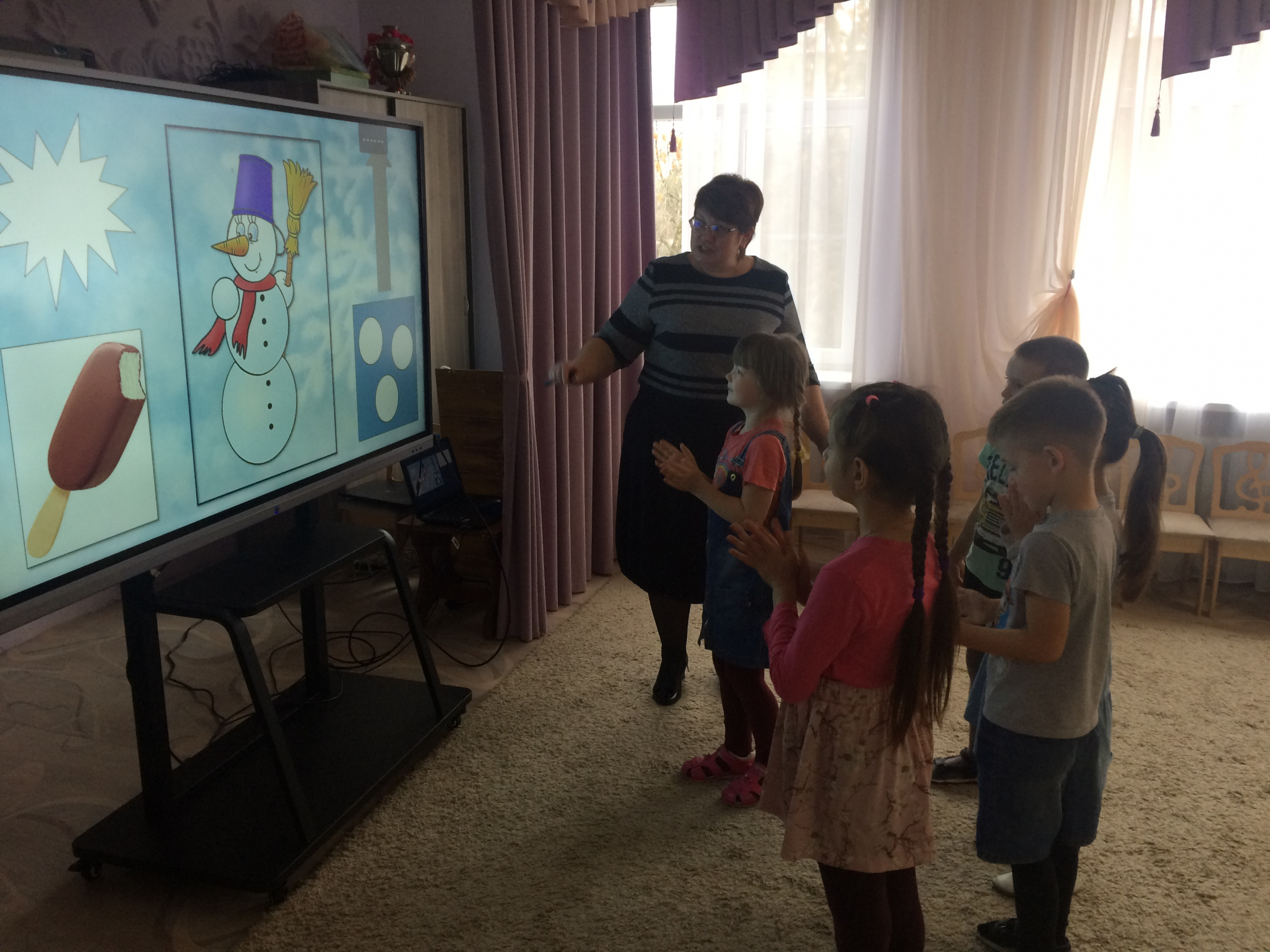 Учитель-дефектолог: Чтобы их убрать, надо о снежинках красивые слова сказать. Слово называем, снежинку убираем (Мокрая, холодная, колючая, резная, белая, серебристая. Снимая последнюю снежинку, дети обнаруживают снеговика. Звук волшебной музыки (на металлофоне), снеговик «оживает» – учитель-логопед надевает куклу би-ба-бо на руку.)