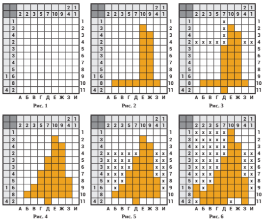 Ну, а теперь отметим крестиками пустые поля (Рис. 5). Далее появляется возможность заполнить столбцы А, Б, В, Г, Д, Е, и головоломка почти решена (Рис. 6).