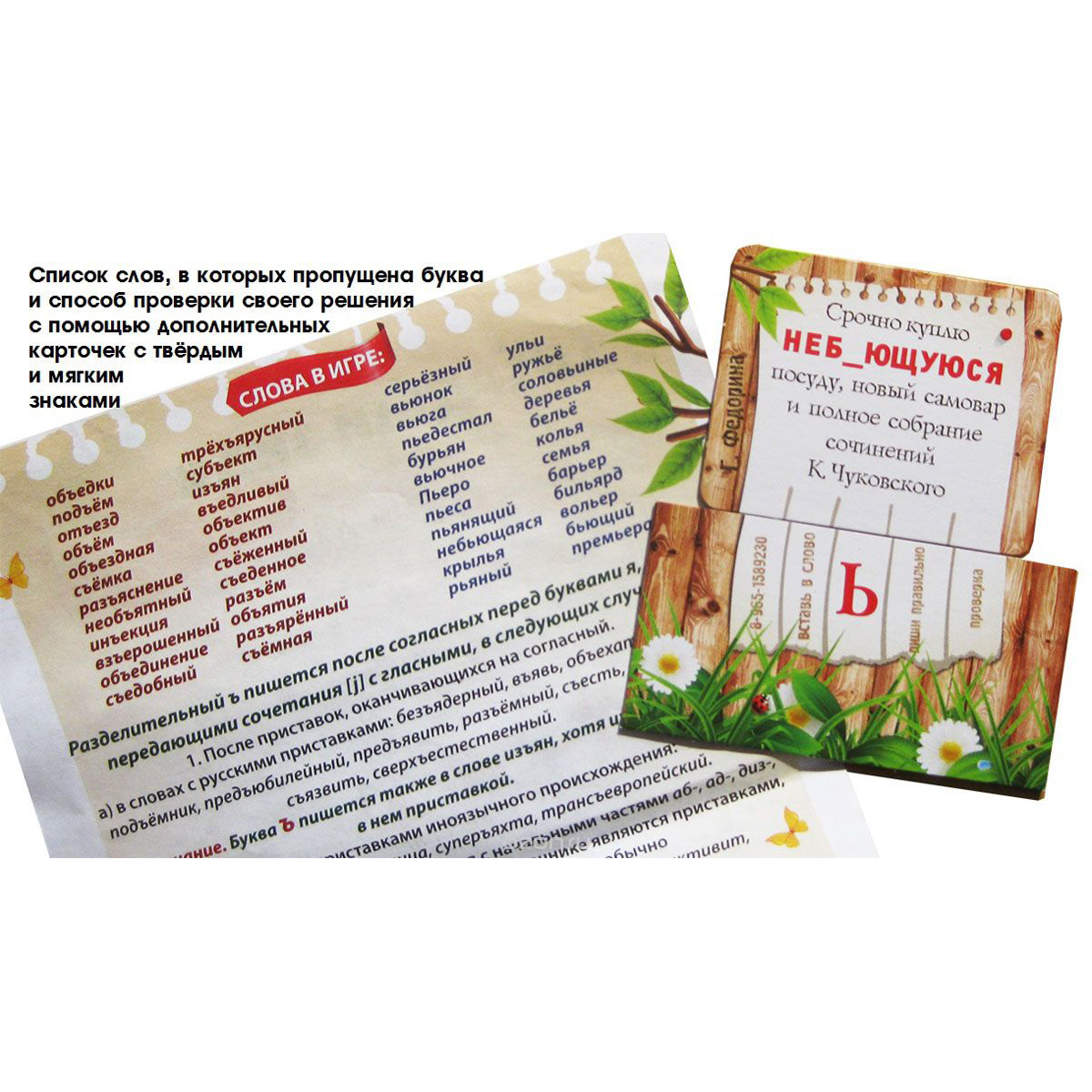 Перед нами интересная и яркая коробочка, в которой находятся всего 52 карточки и подробная иллюстрированная инструкция с правилами и вариантами игр. Итак, 48 карточек – это различные объявления сказочных героев и 4 проверочные карточки. В каждом объявлении вам непременно встретится слово, в котором пропущен твёрдый или мягкий знак. Задача игроков: правильно вставить пропущенную букву. Налево складываем карточки с мягким знаком, направо – с твёрдым. Но в отличие от сказки, здесь волшебства не будет, и вспоминать правописание разделительных знаков придётся самостоятельно. А с помощью дополнительных карточек можно проверить себя. Заодно, вспоминаем и отгадываем, кто из сказочных персонажей мог бы написать то или иное объявление и в какой именно сказке встречается этот герой. Например, «Куплю небьющуюся посуду, новый самовар и полное собрание сочинений К.Чуковского» – скорее всего автор этого объявления бабушка Федора. А робот разместил такое объявление: «Утерян электрический разъём. Нашедшего прошу вернуть за дружеский положительный разряд».